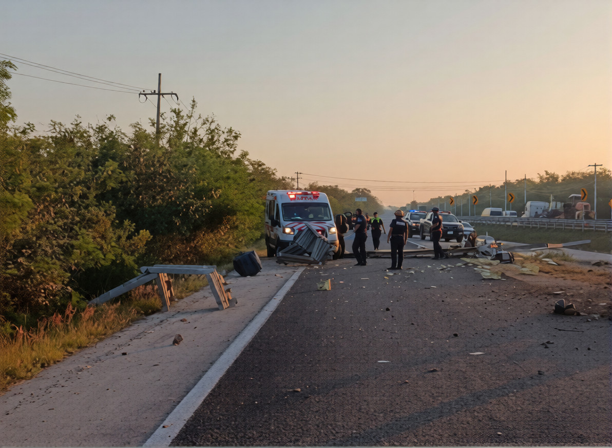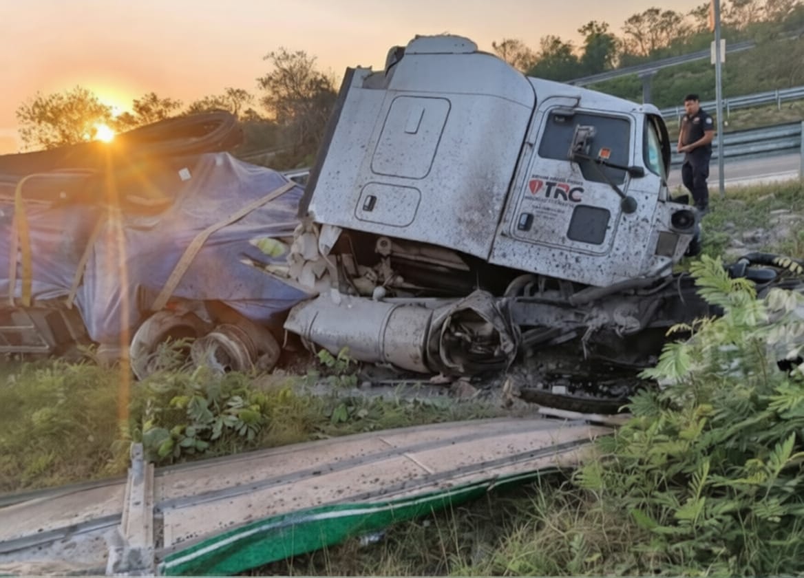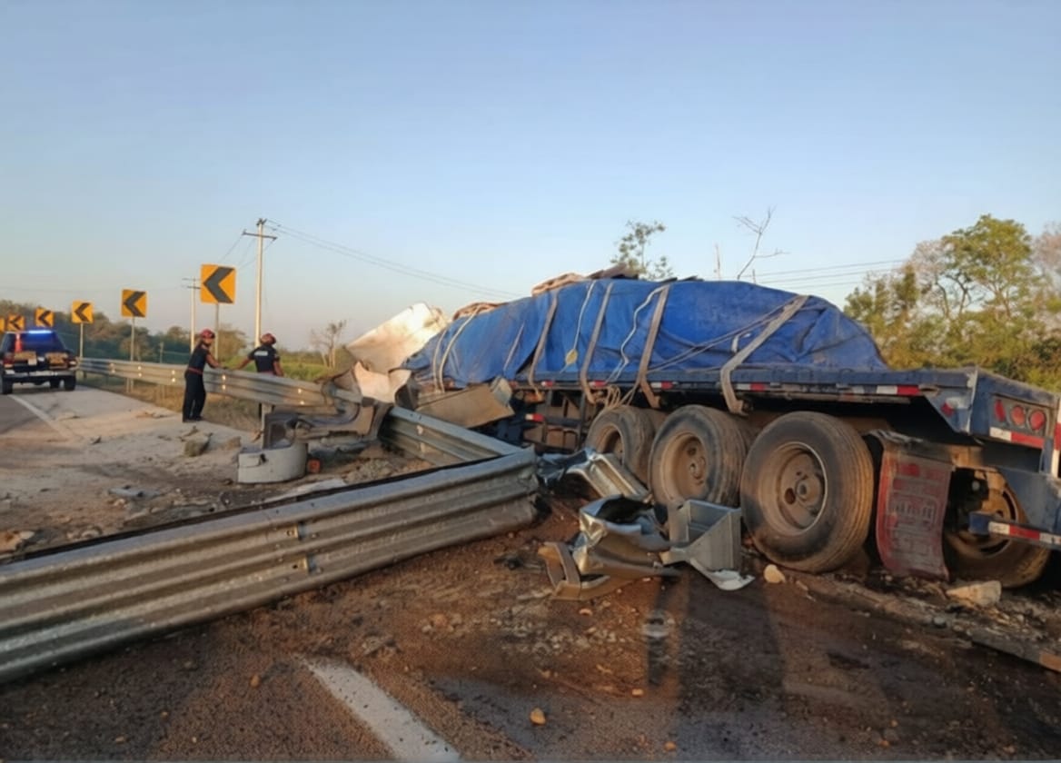 Un tractocamión colisionó contra un muro de contención metálico y dejó a dos personas lesionadas, en la carretera federal Mérida-Campeche.