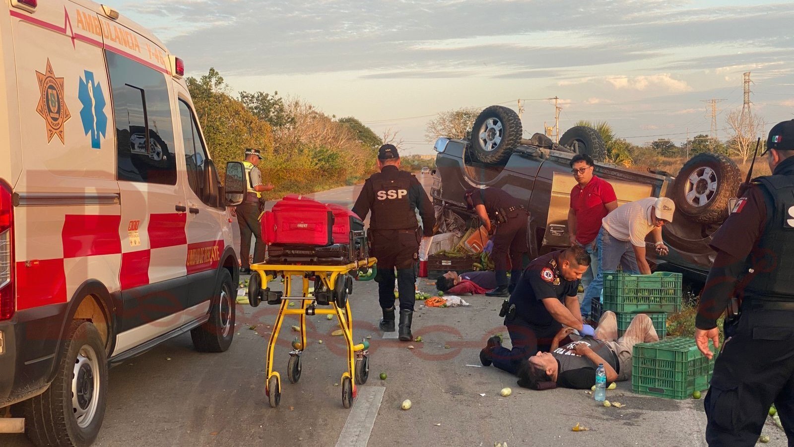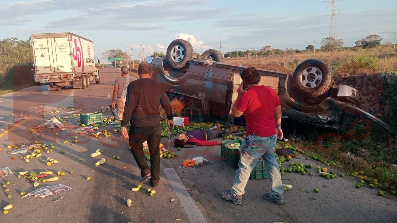 Dos personas lesionadas y verduras esparcidas sobre la vía fue el saldo de un accidente, registrado la tarde de este jueves en la carretera federal Tizimín–Mérida.